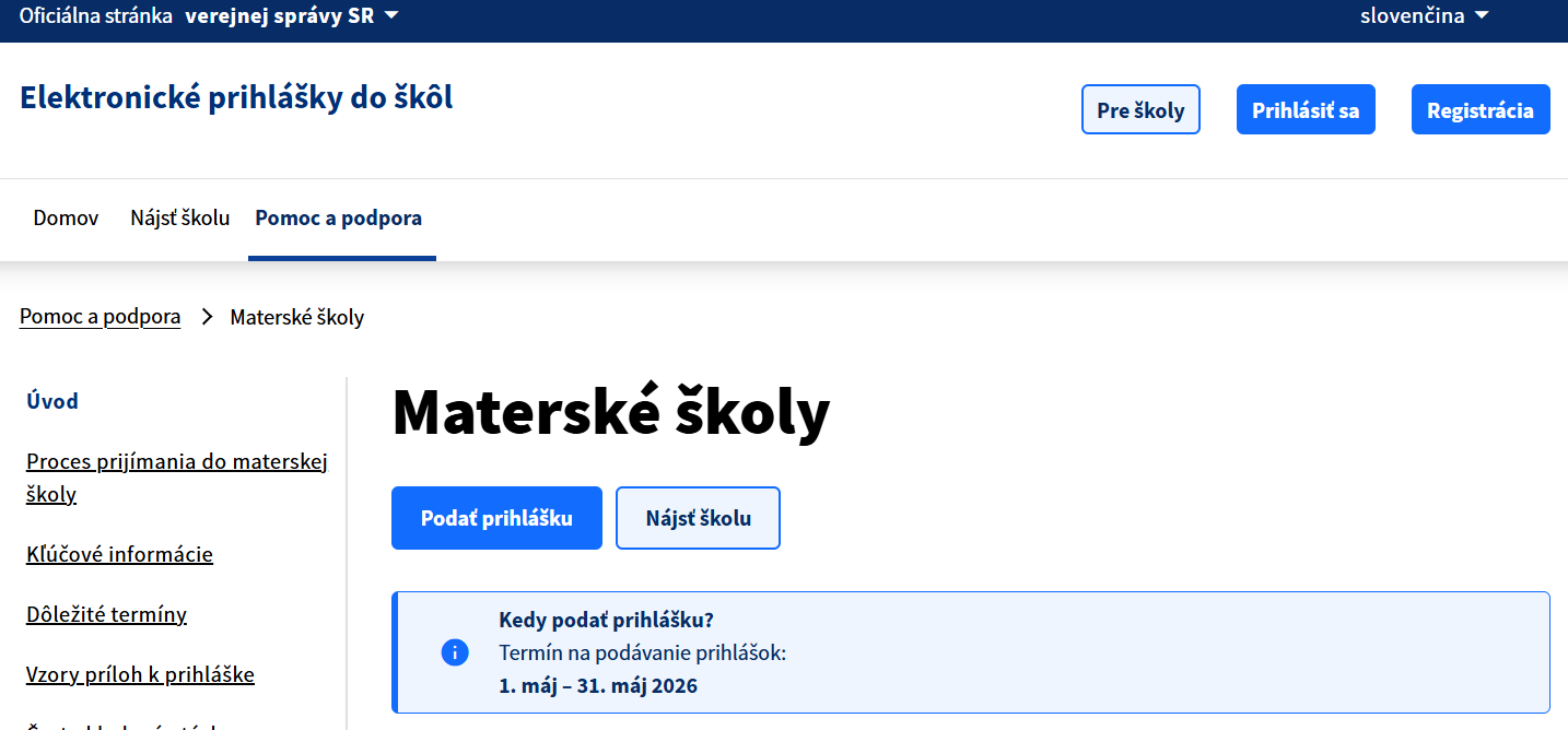 - Bližšie informácie k podávaniu prihlášky nájdete v sekcii: "Proces prijímania do materskej školy"